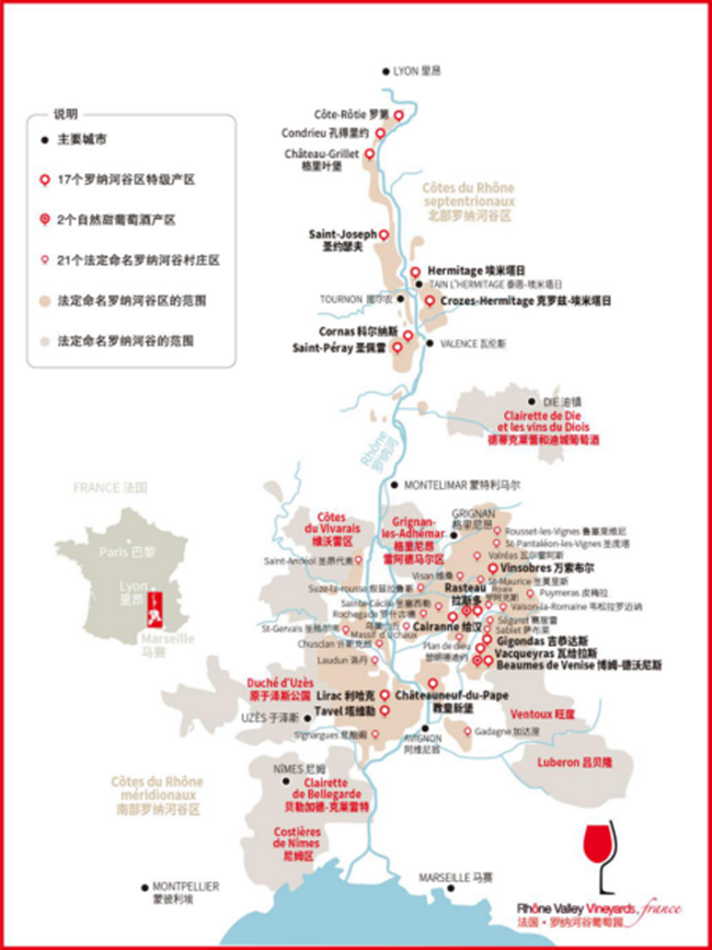 發(fā)源于阿爾卑斯山(Alps)的羅納河(Rhone River)是法國的主要河流之一,它綿延800余公里,最終向南流入地中海,也滋養(yǎng)了法國最重要的葡萄酒產(chǎn)區(qū)之一——羅納河谷葡萄園(Rhone Valley Vineyards),是這里名副其實的“母親河”。