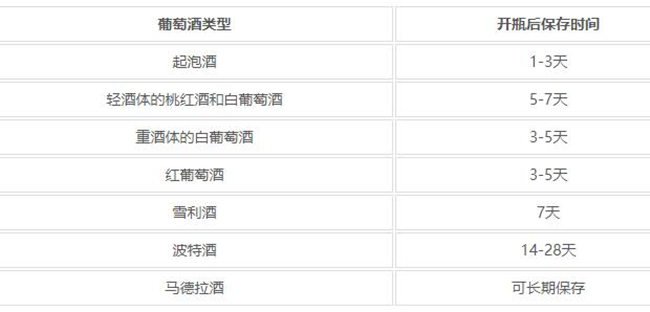 不同類型的葡萄酒,其開瓶后能夠保存的時(shí)間也不一樣。具體如下: