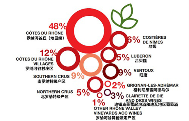 羅納河谷丘是羅納河谷葡萄園的明星產(chǎn)區(qū)。在這里,各個子產(chǎn)區(qū)從低到高依次被劃分為三個等級——羅納河谷丘(Cotes du Rhone AOC)、羅納河谷村莊區(qū)(Cotes du Rhone Villages AOC,有譯為“羅納河谷丘村莊級”)以及羅納河谷區(qū)特級產(chǎn)區(qū)(Cotes du Rhone Crus AOC,有譯為“羅納河谷丘特級村”;南、北羅納河谷葡萄園分別有9個和8個特級產(chǎn)區(qū),共計17個特級產(chǎn)區(qū))。2019年,羅納河谷丘(地區(qū)級)的產(chǎn)量為1.33億升,占整個羅納河谷葡萄酒產(chǎn)量的48%;羅納河谷村莊區(qū)的產(chǎn)量為0.34億升,占總產(chǎn)量的12%;羅納河谷區(qū)特級產(chǎn)區(qū)的產(chǎn)量為0.38億升,占總產(chǎn)量的14%。合計起來,羅納河谷丘對羅納河谷葡萄酒總產(chǎn)量的貢獻(xiàn)率達(dá)74%,地位舉足輕重。