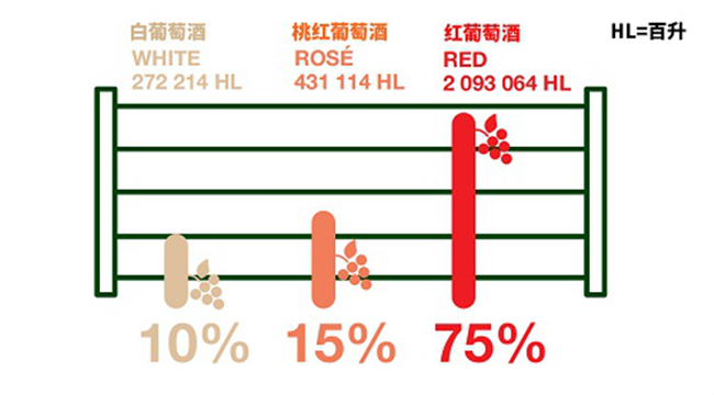 2019年,在羅納河谷葡萄酒約2.8億升的總產(chǎn)量中,紅葡萄酒貢獻(xiàn)了近2.09億升,占總產(chǎn)量的75%;桃紅葡萄酒的產(chǎn)量約為0.43億升,占總產(chǎn)量的15%;白葡萄酒的產(chǎn)量約為0.27億升,占總產(chǎn)量的10%。