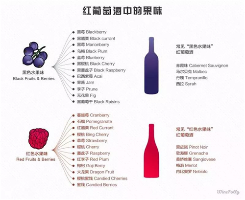 ?、偌t葡萄酒中的果味有兩類,紅色水果和黑色水果,這是盲品中判斷葡萄酒風格的一大依據;