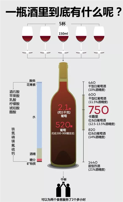 干型葡萄酒含零脂肪以及0-2克碳水化合物,甜型葡萄酒也不含脂肪,但含有3-39克碳水化合物,一瓶葡萄酒大概有2.65磅(約1.2kg)