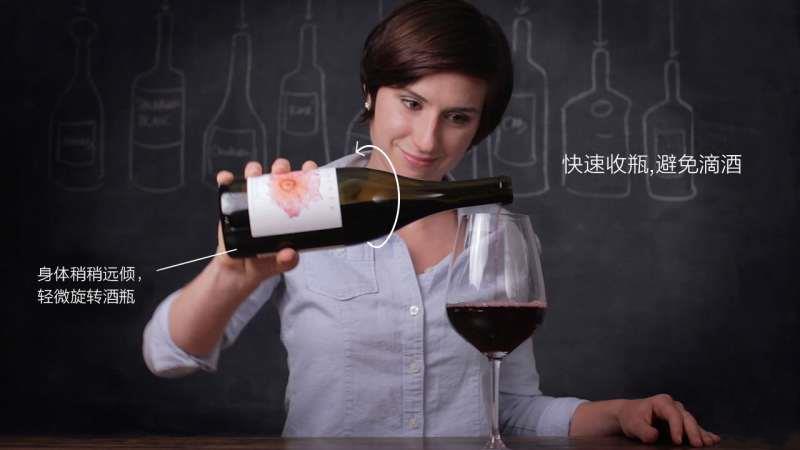 當倒酒者感到杯中的酒量快要達到要求時,可將身體稍稍遠離酒瓶,再輕微旋轉酒瓶底部并快速收瓶,這樣就能在沒有任何工具護佑的情況下也能避免滴酒。當然,這是一個需要不斷練習的動作。