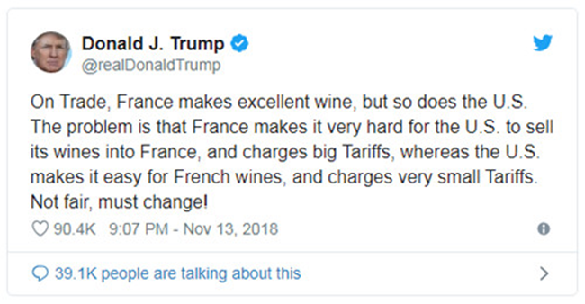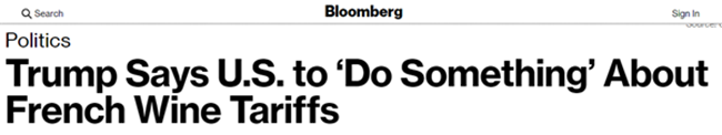 其實(shí),川普盯上法國葡萄酒也不是頭一回了,之前就在推特上發(fā)文炮轟,痛斥法國在葡萄酒貿(mào)易上“霸道”,說的也是關(guān)稅的事。