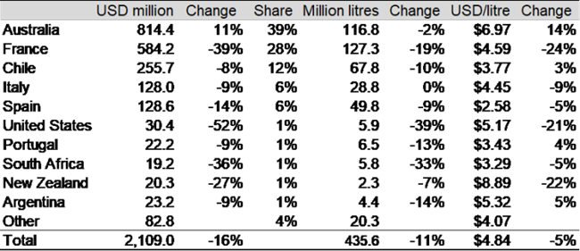 在此期間,澳大利亞葡萄酒對中國市場(包括香港和澳門)的出口額增長了 13%至 12.5 億澳元,出口量下滑 11%至 1.37 億升 (等量于 1520 萬箱 9 升裝)。平均出口額增長 27%至 9.11 澳元/升(離岸價)的創(chuàng)紀(jì)錄水平。