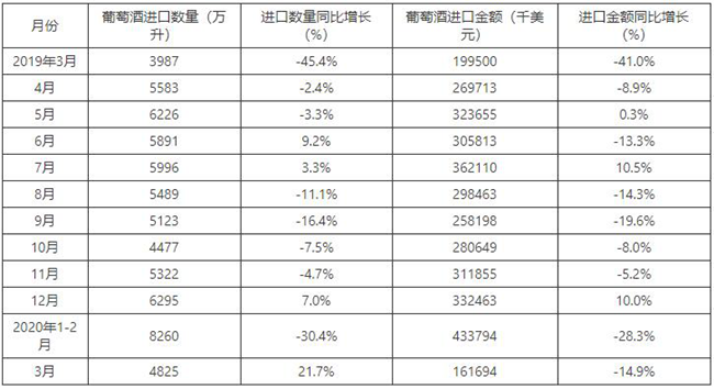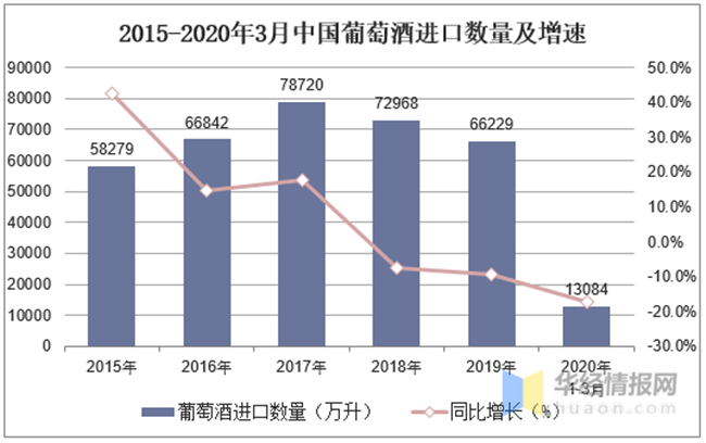 2015-2020年3月中國葡萄酒進(jìn)口數(shù)量及增速