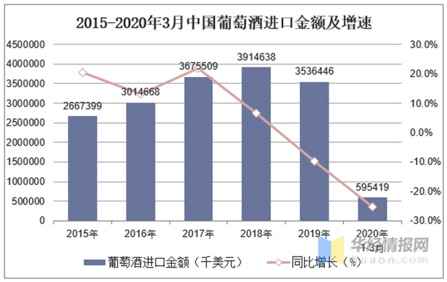 2015-2020年3月中國葡萄酒進(jìn)口金額及增速