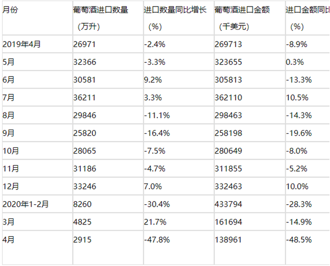 從數(shù)據(jù)來看,2020年1-4月中國葡萄酒進(jìn)口量與1-3月下降的17.4%將比,降幅再一次擴(kuò)大,進(jìn)口金額與1-3月的25.1%降幅相比,再次擴(kuò)大6%。與此同時(shí),2020年3月中國葡萄酒呈現(xiàn)出量增價(jià)減趨勢,4月則量價(jià)齊跌。