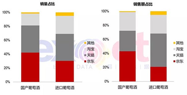 國(guó)產(chǎn)及進(jìn)口葡萄酒各平臺(tái)市場(chǎng)份額占比(2017)