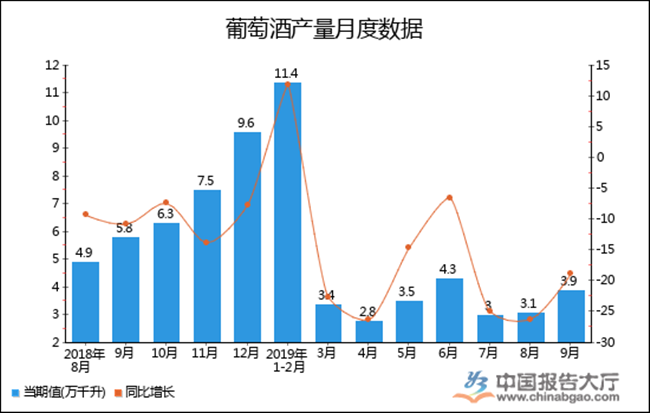2019年9月全國葡萄酒產量為3.9萬千升,累計值為30.3萬千升,同比下降18.8%,累計下降10.4%。