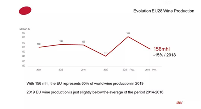 歐盟國家2019年葡萄酒產(chǎn)量156億升(mhl),占據(jù)全球葡萄酒產(chǎn)量的60%,略低于2014-2016年平均水平。