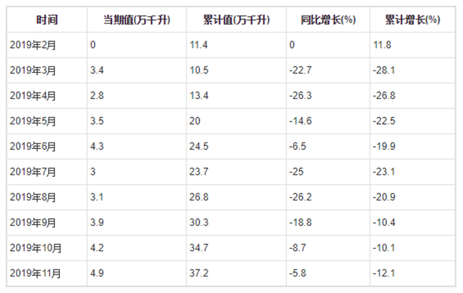 2019年1-11月全國(guó)葡萄酒產(chǎn)量分月數(shù)據(jù)