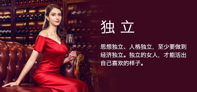 一、獨(dú)立:獨(dú)立的女性總是那么的吸引人,獨(dú)立的女性能夠活出自己的風(fēng)采,思想上的獨(dú)立和人格上的獨(dú)立造就了女性不同的魅力,讓人心生愛慕。如同紅酒,每一款都有著其獨(dú)特的香氣,讓紅酒愛好者迷醉其中。