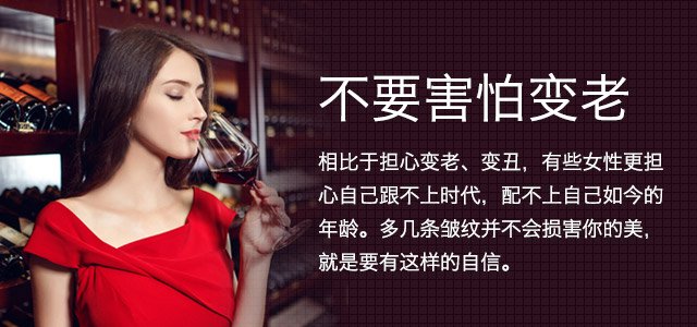 七、不要害怕變老:時(shí)間會(huì)改變?nèi)蓊?,葡萄酒也?huì)隨著時(shí)間的流逝而改變其本身瑰麗的色澤。每一位女性就像一瓶瓶具有陳年價(jià)值的紅酒,在最初釀制的酸澀,如女性青春年少的清新自然;而后陳年到最佳適飲年份,這時(shí)候的紅酒就像到了最具女性魅力的黃金年華,端莊優(yōu)雅;再隨后這瓶葡萄酒陳年變成了老酒,這時(shí)候的葡萄酒雖然過(guò)了最佳適飲年份,風(fēng)味卻更加的復(fù)雜,不少紅酒愛好者都不遺余力的追逐這些陳年老酒。而這時(shí)候的女性因?yàn)闀r(shí)間、閱歷的沉淀,沒(méi)有了青澀,卻更加大氣,貴氣自生。