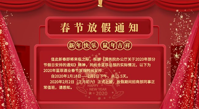 自2020年1月18日——2月2日上午,共15.5天,為藍菲酒業春節假期,于2月2日下午13: 30 (正月初九)正式上班,放假期間公司安排人員正常值班,請悉知。
